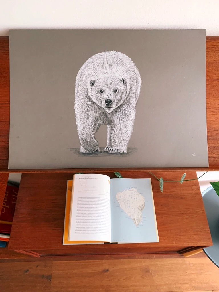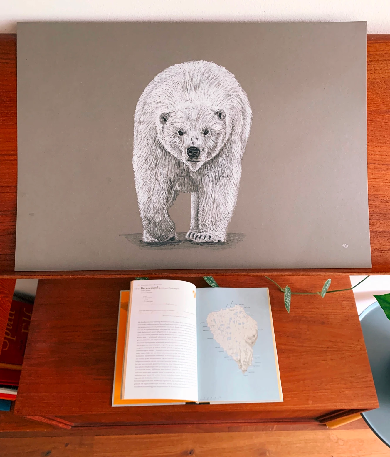 30 oktober 2021Houtskool IJsbeerIJsbeer op A3 gris papier, met zwart en wit houtskool.