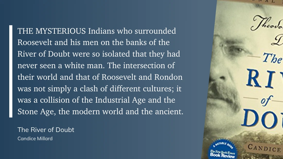 In het geweldige River of Doubt, door Candice Millard, blijkt dat Roosevelt’s interesse voor natuur én ontdekkingsreizen niet bij woorden bleef. Na een mislukte poging om in 1912 als onafhankelijke kandidaat voor de 3e keer president te worden, besluit Roosevelt om zelf ontdekkingsreiziger te worden. Hij zet een expeditie op om de nauwelijks bekende Rio da Dúvida, een rivier in de Amazone, in kaart te brengen. De combinatie van zware houten kano’s en hoogteverschillen zorgt voor een moeizame expeditie. In de jungle raakt Roosevelt ernstig gewond en hij moet door de andere expeditieleden levend de jungle uitgebracht worden. De 760km lange rivier wordt uiteindelijk hernoemd naar Roosevelt River.