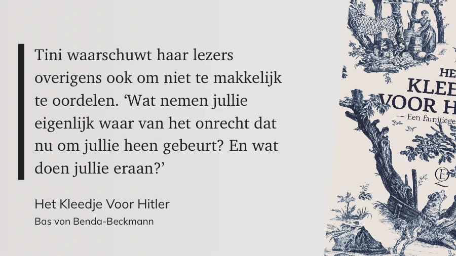 Hierbij spelen ook de brieven van zijn oudtante Tini een grote rol. Zij keerde zich eerder en nadrukkelijker dan haar familie af van het naziregime, en haar dagboeken en brieven geven een inkijk in de dilemma’s die dit meebracht. Zoals NRC schreef ‘als je het dichtslaat heb je bijna ongemerkt een stevige geschiedenisles van meer dan 600 pagina’s achter de kiezen‘.